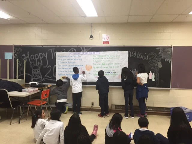 Then Elita invited the kids to come up and draw pictures of the things that God made. Some of them were so excited to draw, that they didn't wait for her to finish giving instructions. They rushed to the front! They drew reptiles, birds, fish and trees. They came up with so many things! When they were done, we sang "All Creatures of Our God and King". It was rough at the start (since it was a new song to most), but eventually everyone was singing along.