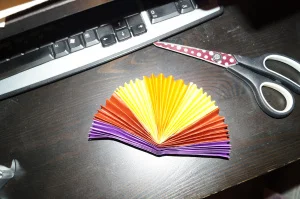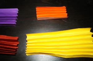 1. Make accordion folds of all the Origami sheets. Now cut the orange sheet in the center (we need just one part of the cut orange sheet accordion).